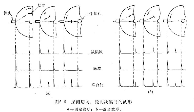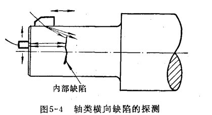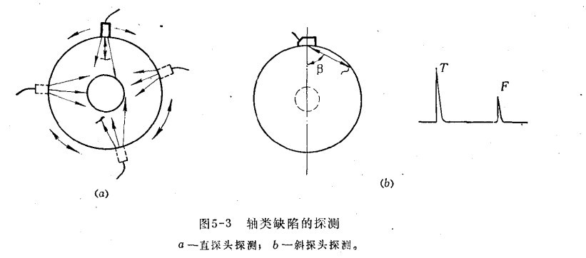 三、大型鍛件的探傷 (1)軸類鍛件的探傷 軸類鍛件如發(fā)動機主軸,汽輪機及發(fā)電機的轉(zhuǎn)子軸以及柴油機曲軸等,在運轉(zhuǎn)時,轉(zhuǎn)速很高,承受中、高載荷,為了保證軸類鍛件能正常工作,必須使用超聲波探傷儀探測其缺陷。探測方法一般用脈沖發(fā)射法,頻率通常用2.5兆赫。用直探頭在軸的周圍上探測時,利用直探頭的中心聲束來發(fā)現(xiàn)與軸徑向中心線垂直或接近垂直的缺陷,并依靠探頭的擴散聲束來發(fā)現(xiàn)與軸徑向中心線平行或接近平行的缺陷,如下圖所示a,用斜探頭沿軸的圓周方向探測時,可有效的發(fā)現(xiàn)徑向缺陷,特別是近于軸表面的裂紋,如圖b所示。橫向缺陷,可用直探頭在軸的兩端探測,但有的缺陷處于圓角近表面或缺陷較小距離又遠(yuǎn),而用直探頭探測難以發(fā)現(xiàn)時,可用斜探頭沿軸的長度方向探測,如圖2。