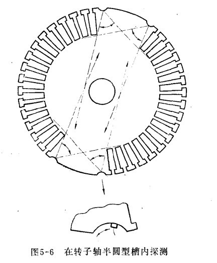 對安裝完畢的電機轉(zhuǎn)子軸而言,因形狀復(fù)雜,若用通用的方法探測,則使探測范圍受到限制,有些區(qū)域內(nèi)的缺陷不能發(fā)現(xiàn),因而可在電機轉(zhuǎn)子的大齒面上開四個半圓形的槽,將具有相應(yīng)曲率的探頭放在此槽內(nèi)擺動,使聲束能掃查到所有截面,這樣,能探測到大部分區(qū)域,如下圖。