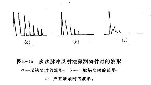 探傷鑄件的方法,通常采用多次脈沖反射法,有時也用一次脈沖反射法來確定缺陷位置。多次脈沖發(fā)射法是利用聲波在缺陷界面的反射和缺陷對聲波衰減的原理進行探測的。對于較厚且形狀簡單的工件,用此方法探測是比較適宜的。當工件內(nèi)部無缺陷時,則出現(xiàn)鑄件底部的多次反射波,其波幅鑄件減小,并呈指數(shù)曲線衰減,如下圖a所示,當工件內(nèi)部存在疏松等缺陷時,會造成聲波散射,使聲能衰減,則底波反射次數(shù)減少,如下圖b所示,當工件內(nèi)部存在嚴重的缺陷,則底波消失或只有雜波,如下圖c所示。由工件底波的衰減狀態(tài),即可判斷有無缺陷和嚴重程度。