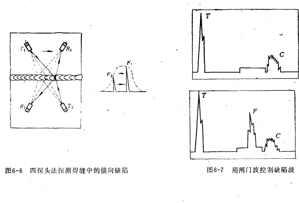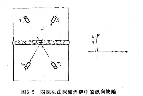 (二)四探頭法 四探頭法可探測厚度為4~12毫米的薄板對接焊縫中的裂紋、未焊透、條狀夾渣等缺陷。而且還可以進行探傷儀自動探測。四探頭法為兩組探頭(T為發(fā)射探頭,R為接收探頭),用機械固定并分別放在焊縫兩側(距焊縫軸線距離相等),探傷時沿焊縫同時移動。探測縱向缺陷時,T1R1為一組探頭,T2R2為一組當焊縫中無缺陷時,熒光屏上只出現(xiàn)焊角反射波。如有缺陷,則在焊角反射波之前出現(xiàn)缺陷波F(如缺陷在焊縫中間,則兩組探頭所得缺陷波重疊在一起),探頭移動時,缺陷波的幅度改變。