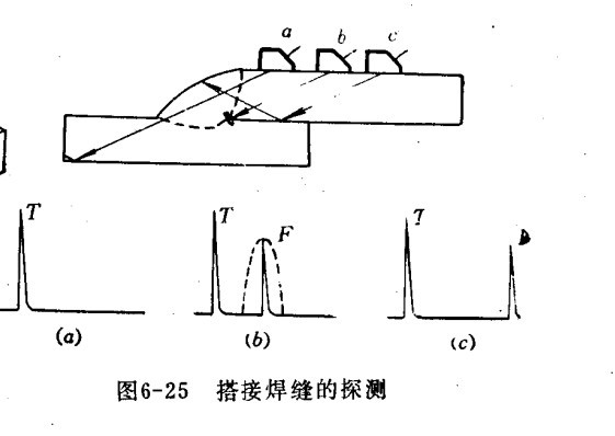 二、搭接焊縫探傷 搭接焊縫探傷可用下圖方法所示,探頭在c位置時,熒光屏上出現(xiàn)焊角反射波。當(dāng)探頭向焊縫方向移動,聲波遇到缺陷時,將出現(xiàn)缺陷波。超聲波探傷儀探頭在b位置時,缺陷波最大,探頭由b向前移動時,缺陷波幅逐漸降低(缺陷波位置前移)。探頭在a位置時,聲波透過焊縫,在下部板中傳播,熒光屏上無射波。