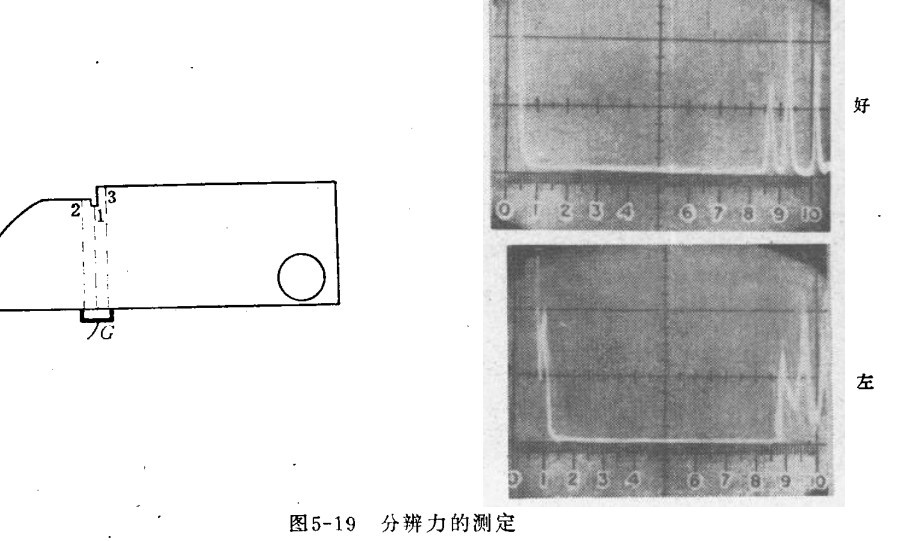 六、分辨力的測定 下圖探頭在G位置,可測定分辨力。探頭移動(dòng),使之在85、91和100刻度處獲得三個(gè)回波。如果三個(gè)波是分離的,則分辨力好。否則,分辨力差。