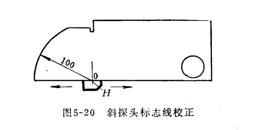 七、斜探頭波束零點(diǎn)線的校正 斜探頭有機(jī)玻璃楔塊上的零點(diǎn)線和壓電晶片的中心線重合。斜探頭在H位置移動(dòng),直到從100毫米弧度處獲得最大的反射波為止,如斜探頭零點(diǎn)線與試塊上0點(diǎn)重合,則斜探頭的零點(diǎn)線正確。否則,需移動(dòng)探頭的晶片,直至重合為止。此時(shí)斜探頭的零點(diǎn)線即為聲波主線的入射點(diǎn)。
