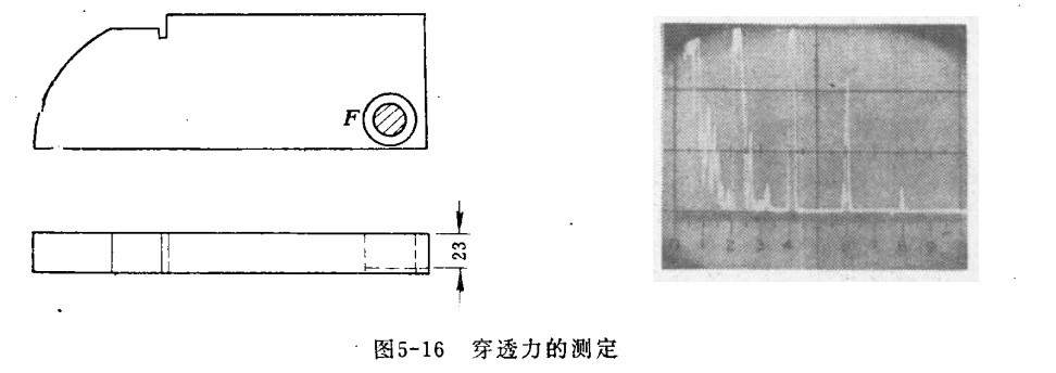 三、放大器線性的測定 如下圖所示,將超聲波探傷儀探頭放在F位置的有機(jī)玻璃塊上探測,有機(jī)玻璃的厚度相當(dāng)于50毫米鋼的厚度。測定時(shí),靈敏度的控制由最小開至最大,高穿透力儀器有6~10個(gè)反射波,低穿透力的儀器只有2~4個(gè)反射波。
