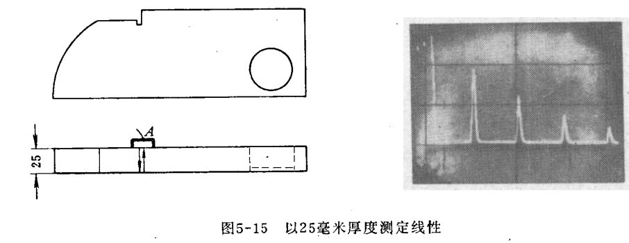 二、時(shí)間基線(掃描線)線性的測定 用直探頭(縱波)測定,發(fā)射波調(diào)整在熒光屏的零點(diǎn)上。例如時(shí)間基線為0~100毫米時(shí),將探頭放在試塊的A位置,以25毫米的多次反射波進(jìn)行校正。微調(diào)掃描速度,使第一次反射波出現(xiàn)在25處,如果掃描線性好,第二、三、四次應(yīng)分別與50、75、100刻度重合。否則多次反射波不成比例的出現(xiàn)在熒光屏上。