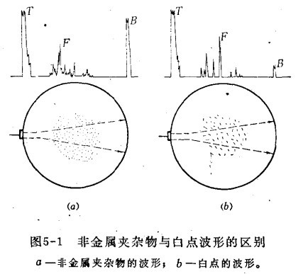 鍛件中常見(jiàn)的缺陷有偏折、疏松、非金屬夾雜物、氣夾、白點(diǎn)、縮孔、裂紋等。白點(diǎn)及裂紋是危險(xiǎn)性缺陷。白點(diǎn)與非金屬夾雜物的波形如下圖,探測(cè)時(shí)應(yīng)注意區(qū)別。