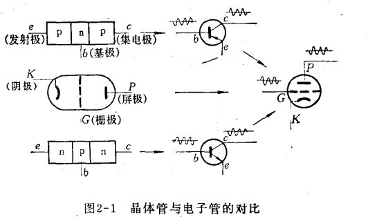 晶體管有pnp型及npn型之分。晶體管的集電極(c)、基極(b)及發(fā)射及(e),分別相當于電子管的屏極(P)、柵極(G)及陰極(K)