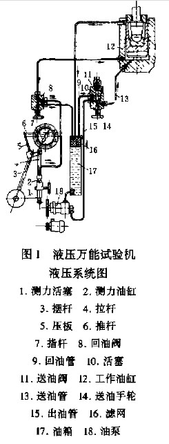 液壓萬能試驗機主要用于金屬材料的拉伸、壓縮、彎曲及剪切等實驗,也可做木材、水泥及混凝土等的壓縮及彎曲試驗,廣泛地應(yīng)用于科研機關(guān)、基本建設(shè)單位、冶金和機械制造廠以及大專院校的實驗室,液壓萬能試驗機在使用過程中會發(fā)生一些故障,故障較難查找,若不及時維修,又會影響其正常使用,我們在試用和維修過程中積累了一些經(jīng)驗,敘述如下,為該種類試驗機的修理提供方便。