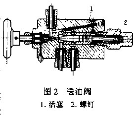 (2)送油閥內(nèi)有雜質(zhì)。當(dāng)不干凈的東西如鐵沫、油渣等隨油帶到送油閥(如圖二)的內(nèi)部時,易使活塞受損,同時對指針平穩(wěn)上升亦有影響,要取出這些不清潔的東西,可擰下螺釘2用小絲桿從后面擰在活塞1上把它拉出來,用油清洗閥體內(nèi)孔、活塞,然后重新裝上活塞及螺釘2,裝螺釘2時質(zhì)疑內(nèi)部必須灌油再擰上,使內(nèi)部不存有空氣,否則會影響油閥正常使用。