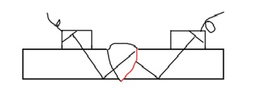 圖 1 ,對(duì)接焊,焊縫余高未磨平、只能單面探測(cè)??墒褂眯碧筋^、觀察一次或二次回波,在焊縫兩側(cè)進(jìn)行掃查探傷。