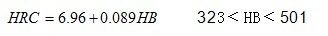此公式用我國公布的黑色金屬硬度標(biāo)準(zhǔn)數(shù)據(jù)進(jìn)行換算,其HRC誤差基本上在±0.4HRC 范圍內(nèi),其最大誤差也僅士0.9HRC,計(jì)算的HV誤差最大為±15HV。